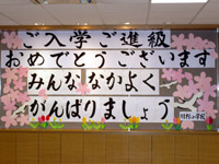 | 小学校校舎には、入学式を迎えた新入生、そして進級した在校生にメッセージが掲げられました。 |