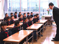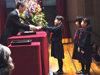 新入生は大講堂の厳かな雰囲気の中を立派に入場することができました。校長先生からは校章の授与、そして「ありがとうの気持ちを大切に、たくさんのことを学んでいきましょう」とお話がありました。式が終わると6年生のお姉さんから校章をつけていただき、記念写真を撮影しました。小学生になった喜びと自信にあふれた新入生の前向きな気持ちを大切にして、いよいよ小学校生活がスタートします。 |