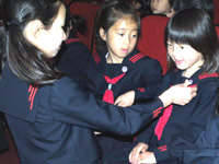 | 6年生のお姉さんが、一人一人に校章をつけてくださいました。これで、川村小学校の制服と校章がそろい、立派な1年生です。 |