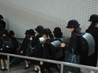 | 班長さんが人員確認をしています。確認が済んだ人は、2列できちんと並んでいます。 |