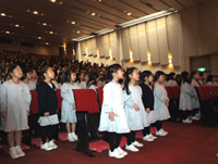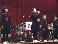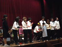 | 学園歌の大合唱を終え、あっという間に終演。熱い余韻の中、花束贈呈と6年生によるお礼のことばありました。 |