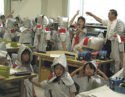 地震発生時の対応に続き、交通機関が遮断された場合を想定した災害時待機教室への移動を訓練しました。人員点呼で全員の無事と校舎内の安全が確認されると、指定の待機教室へ移動、再度人員点呼を行いました。 |