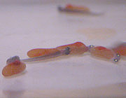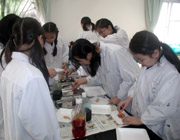 | 5年生が理科の単元「受けつがれる生命」の一環として、サケの観察学習を行っています。温度管理された水槽で、今年も順調に卵から稚魚にかえりました。 20匹目がかえる日を当てるサケクイズでは、12月6日が解答で、118名の児童が正解しました。サケの観察カードも用意され、全校児童の目が理科室前のサケ水槽に集まっています。なお、大切に育てた稚魚は、2007年2月に多摩川に放流することになります。 |