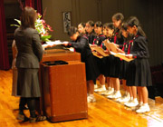 副校長先生からは月間目標『反省』にちなみ、2学期を振り返り、毎日コツコツと勉強に励むことができた人が多かったことや、校外学習での各学年の成長ぶりをうれしく思っているとのお話がありました。(写真:4年生図画コンクール表彰) |