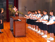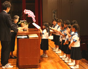 6月の誕生会では今月の誕生者を皆で心をこめてお祝いし、元気いっぱい歌を歌いました。その後1年生の図画コンクールの表彰を行い、9名の優秀作品に対し校長賞を始めとする各賞が贈られました。 |