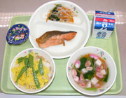 7月6日(金)は七夕メニューの会食でした。七夕汁には、天の川をイメージしたそうめんと七夕かざりを思わせるきれいなお麩が入っていました。ちらし寿司、星型の七夕ゼリーもおいしくいただきました。
