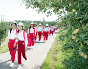 色づきかけたリンゴ園でも、楽しく学習。