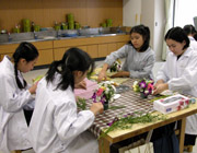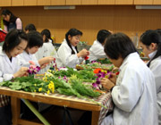 梅組はガーベラとデンファレ、コギクと杉の4種類の花材を使っての、フラワーアレンジメント作りを楽しみました。各々のセンスを活かしオアシスに挿してデザインし、とても素敵な作品がたくさんできました。 |