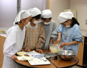 松組はお菓子作りに挑戦し、大好きなマドレーヌを作りました。教えられた通りの手順で粉をふるい、泡立てた卵と砂糖、溶かしバターを混ぜ合わせて型に入れ、コンベックで焼き上げました。皆で紅茶と一緒に美味しくいただき、一つはお土産に持ち帰りました。 |