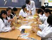 竹組は葉脈標本による栞作りに挑戦しました。ベニカナメモチ、ツバキ、ヒイラギの3種類の葉っぱの葉肉を歯ブラシで取り除いて好きな色に染色し、よく乾燥させてパウチし、最後にリボンをつけて素敵な栞に仕上げました。 |