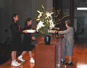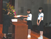 小学校では毎月大講堂で、誕生会を行っています。名前を呼ばれた誕生者は大きな声で返事をして立ち、記念品授与・感謝の舞の後、代表者によりお祝いの言葉・お礼の言葉が述べられます。最後に、誕生日の歌とその月の歌を歌い、全校で誕生者をお祝いしています。また、その月の月間目標について副校長先生の講話があります。4月は、「平和」について話していただきました。 |