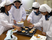 梅組はマドレーヌ作りに挑戦しました。粉をふるったり、卵を泡立てたり、という初めての作業も協力して行うことができました。生地を入れた型を鉄板に並べてコンベックに入れると、徐々に膨らむ様子を興味深く見つめていました。甘い香りが広がると児童の笑顔も広がり、待ちに待ったマドレーヌの完成です。みんなで作ったマドレーヌはとても美味しく、お土産を召し上がったご家族からもお褒めの言葉を頂いたようです。 |