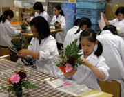 竹組はガーベラ、小菊、けいとう、レザーファンを使ってフラワーアレンジメントに挑戦しました。色や高さなどのバランスを考えながら慎重にオアシスに挿していき、各自で持ってきた包装紙やリボンでラッピングをして完成です。クラスみんなの作品を見て回る鑑賞会では、いろいろなアレンジメントやラッピングに感心していました。どれもその人らしさが感じられる作品になっていたようです。 |