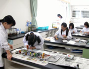 6年生は理科の授業で魚の解剖をしました。魚はブリの小さなものでイナダという魚です。先生の説明をよく聞いてから、解剖用のハサミで注意しながらお腹を切り開き、浮き袋や心臓、えらなどの各器官を観察し、魚の体の構造を勉強しました。泳ぐのに適した体の形や仕組みについてよく理解することができました。 |