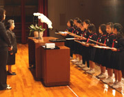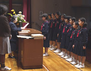 3年生が東初協音楽祭に参加し、合唱曲「地球のかぞく」と合唱奏「スーパーカリフラジリスティックエクスピアリドーシャス」の2曲を披露しました。緊張しながらも堂々と頑張り、昭和女子大学人見記念講堂の観客の皆さんを、3年生らしい元気の良さとかわいらしい笑顔で魅了することができました。 |