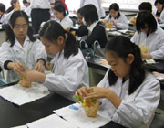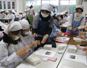 竹組は和菓子作りを楽しみました。こしあんを練りきりで丁寧に包んだ『ひさご』と、栗のいがに見立てた黄色い餡に栗をのせた『深山路』の2種類を作成しました。最初は、細かい作業に緊張していましたが、作業を重ねるうちに少しずつ慣れていきました。出来上がると、自分で選んだ一つをお茶と一緒にいただき、残りは大切に箱に入れお土産として持ち帰りました。 |