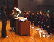 風邪が流行っていたため延期した11月の誕生会と12月の誕生会を合同で行いました。副校長先生からは、11月の月間目標「整頓」と12月の月間目標「反省」にまつわるお話がありました。誕生会終了後、3・4年生図画コンクールと学園祭プログラム表紙絵の表彰式が行われました。3年生のコンクール作品は、スクラッチの「こんなまちにすみたいな」、4年生はテラコッタ素焼きの「魔法の帽子」でした。 |