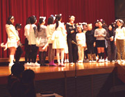 大講堂での発表を目標に、朝・昼休み・そして放課後の練習に励んできたクラブの発表が行われました。今年の発表クラブは、音楽、英語、演劇クラブとなりました。音楽クラブが奏でたトーンチャイムの調べはハリーポッターの映画そのものでした。英語クラブの「シンデレラ」は、英語が好きな部員が熱演しました。最後は演劇部の「百万回生きたねこ」(写真)で、大勢の部員でストーリーを組み立てているので、場面転換がうまく、とてもおもしろい演劇となりました。各クラブの頑張りに、会場からは温かい拍手がおくられていました。 |