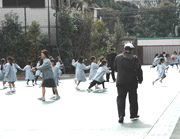小学校での防犯訓練が行われました。校舎北側裏門から不審者が侵入し、昼休みの校庭で楽しく遊んでいた児童たちに近づいていくという想定でした。児童たちはそばにいた先生の指示に従って次々と校舎内に駆け込み、同時に先生方と共に外部に面した窓やドアの施錠も行いました。全員の人数確認と安全確認がとれたところで放送を行い、訓練を終了しました。不審者役の警察官からの講評では、「逃げる時には先生の注意の声が聞こえなくなるのでキャーキャー騒がないこと」、「転ぶと危ないので友だち同士押し合わないこと」、「校舎内避難後は侵入口となるドアや窓の施錠は素早く、かつ漏れなく行うこと」などの諸注意がありました。 |