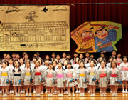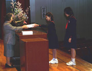 | 卒業式を目前に控えた6年生への感謝の気持ちを込めて、ひな祭り「6年生を送る会」が大講堂にて行われました。6年生を全員が拍手で迎え、可愛らしい1年生の開会の言葉を皮切りに、1年生から5年生までの全ての学年が音楽劇や合唱、合奏などを一生懸命に披露しました。6年生も含め「語り合おう」の全校合唱も行いました。6年生代表による「校歌の舞」もさすがでした。最後に記念品の贈呈と、5年生・1年生によりプレゼント・カード・花束が一人ひとりに壇上で手渡され、感動的なシーンがあちこちで見られました。 |