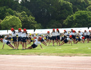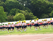 <5年生>笛に合わせて力強く機敏な動きの組み立て体操。