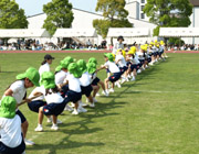3年生の種目は、マスゲーム「生きることってすばらしい」、低学年クラス対抗リレー、全校大玉ころがし、徒競走、綱引きの5種目でした。