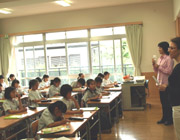 英語の授業は、各学年とも週2回のうち1時間を日本人教師と外国人教師によるティームティーチングで行っています。3年生のこの日の授業はイラストカードを使ったクイズや、外国人教師が話す天気や月日などを聞き取る○×クイズなどを行いました。楽しみながらネイティブな英語のリスニング力も高めていきます。