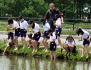 3年生が2泊3日で春の蓼科学習を行いました。山荘周辺で春の花を探してスケッチしたり、タンポポでかんむりや首飾りを作ったりして遊びました。2日目の田植え体験は、田んぼに入る最初の一歩がなかなか出ませんでしたが、時間が経つにつれ泥の感触が心地よくなり楽しみながら苗を植えていました。この苗が生長し秋にはどうなっているのか、今から楽しみにしています。 |