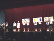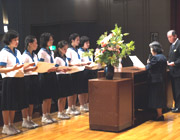 大講堂での7・8月誕生会の後、6年生の図画コンクールの表彰式が行われ、校長賞、入選を受賞した児童が表彰されました。『輝いているネ 6年生のわたし』というタイトルで自画像に取り組み、大胆さと繊細さがうまく調和し、特徴をよくつかんだ作品が出来上がりました。自画像の背景にも輝く質感の紙を用いたので、表情とともに実際にも輝く作品となりました。 |