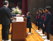 インフルエンザ対策で、しばらくの間、校内放送による誕生会と表彰式が続いていましたが、1月は大講堂に集まり実施することができました。誕生会での6年生によるおごそかな感謝の舞、そして誕生日の歌を全校児童で心を合わせて歌うのは気分の良いものでした。誕生会終了後の書き初め大会の表彰式でも、全校児童から学校長賞・金賞・銀賞・努力賞の受賞者に温かい大きな拍手が送られました。