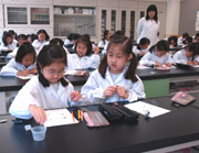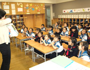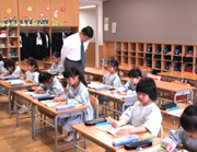 小学校1年生から3年生は、週1時間ずつ、クラスを半分に分け、算数と英語の授業を実施しています。写真は1年生で、10までの数を教具を用いて学習する算数の授業の様子です。先生が黒板に示した数を、5をひと塊と考えてブロックを並べていきました。その場で先生が一人ひとりの手元のブロックを確認することで、間違いを正し、確実に数の概念を理解することができます。