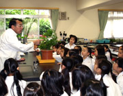 鳥の糞に擬態しているアゲハチョウの幼虫が、ミカンの葉の上にのせられて各班に配られました。まず、班ごとに幼虫の名前をつけました。そして「ケースをきれいにして、新しい葉をあげる。」など、幼虫を育てるための注意事項をクラス全員で確認しました。体の大きさ、色、食欲などをノートに記録し、幼虫の日々の変化を観察していきます。