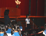 大講堂で4・5月の誕生会が行われました。名前を呼ばれた誕生者は元気よく返事をして立ち上がりました。代表者に記念品のスケッチブックが授与され、感謝の舞、在校生からのお祝いの言葉、お誕生日の歌を合唱して誕生者を全校で祝福しました。誕生者の代表はお礼の言葉を述べました。
