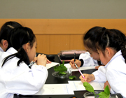 理科の授業では、3年生より理科室を使った観察や実験が始まり、この日、3年竹組は種の観察を行いました。順番に4種類を観察し、その特徴と何の種かを観察カードに記入しました。1つ目は1年生の時に育てたアサガオ、2つ目は屋上菜園にも咲くとても小さい種のホウセンカ、3つ目は縞模様の特徴をもつヒマワリ、4つ目は難問ヘチマでした。観察の楽しさと種の特徴を興味深く学習しました。