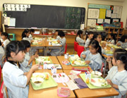 4時間目の授業が終わると会食の時間になり、みんなの笑顔と会話がひときわ弾みます。1・2年生の配膳は、5・6年生のお当番が手伝ってくれ、手際よく準備が進みます。会食室で作られる会食は、材料選びから慎重に行われたバラエティーに富んだメニューです。おいしい会食を、正しい食事マナーで楽しくいただくことを心がけています。