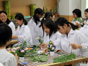 今日の花材は、秋の花であるりんどう、ピンク色のスプレーカーネーションとレザーファンです。5年生で1回フラワーアレンジメントを行っているため、準備が終わった人から手際よくお花をオアシスにさしはじめました。自分で選んだラッピング用品できれいにラッピングをほどこして完成です。 |