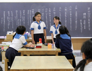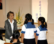 課題図書である『建具職人の千太郎』の作者 岩崎京子先生を招いて講演会を行いました。先生は児童の感想の中に、好きな登場人物について書かれていたことにふれ、その人物のモデルや名前の由来、性格などをお話しくださいました。また、作品をつくるにあったては、実際に自分で足をはこんで話を聞き、体験をし、常に人を観察してアイディアを膨らませ、そして、今の自分に満足することなく、次はもっと良い作品が出来ると思って続けていますとお話がありました。児童は笑ったり、驚いたりしながらお話を聞き、たくさんの質問をしていました。 |