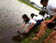 自然と触れ合い探求する2泊3日の春の蓼科学習に行きました。都心より春の遅い蓼科山荘周辺を散歩しながら草花のスケッチをしたり、大きな葉にたんぽぽの花や茎を使って顔を作ったりと「草花あそび」をしました。2日目はいよいよ田植えです。JAの方から説明を受けたあと、児童は裸足になり恐る恐る水田に足をいれました。最初はその感触に戸惑い気味の児童たちでしたが、次第に慣れてくると気持ちよくなってきたようでした。そして水田にはられた紐を頼りに、一株ひとかぶ丁寧に苗を植えていきました。午後はフィールドビンゴを行いました。 |