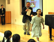 今年も目白警察署スクールサポーターの方にご協力いただき、2〜4年生対象の安全教室が開かれました。これまでの「3つの約束」の他に、「乗らない」、「知らせる」の2つが加わった「いかのおすし」の約束をDVDで勉強しました。「家族が入院したから病院まで連れていってあげる」と家族のことで声をかけてきても、知らない人には絶対についていかない、車には乗らないなどのお話がありました。エレベーター内の安全な場所や駅構内と車内での困ったときの助けの求め方を学習し、最後に「いかのおすし」の歌を歌って「5つの約束」を再確認しました。 |