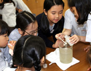 私たちは日常生活で当たり前のように水道水を使っていますが、地球上で飲料水として使用できる水はほんのわずかにすぎません。東京都水道局の水道キャラバンに参加し、その貴重な水が水道水になるまでの水の流れを追いました。春の蓼科学習で行った御泉水や白樺湖の役割と重ね合わせながら、水道水源林やダム、堰の役割をDVDで確認しました。水源林の模型を使い雨水の流れ方を勉強し、雨水がきれいな地下水となるためには、水源林を管理し守っていくことの大切さを学習しました。実験では、濁りの素を入れた水に凝固在を入れて撹拌すると透明に近い水と沈殿物に分かれ、さらに上水をろ過機に入れると、透明な水が落ちてきて驚きました。 |