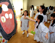 竹組の1・2年生がフリールームで縁日あそびを行いました。この日のために2年生は、5班に分かれて「縁日あそび」の遊び方を考え、1年生に楽しんでもらえようダンボール紙、画用紙、ペットボトルなど様々な材料を使い、それぞれが工夫をこらした看板や景品を作り準備してきました。まずは1年生の教室で、自分たちのお店の紹介と遊び方の説明をしました。そして1年生がフリールームに入ってくると元気よく呼込みをしました。ゲームの道具を渡す係、景品を渡す係、「がんばりましたシール」を貼る係など、役割分担を決め、お友だちと協力しながら進めました。 |