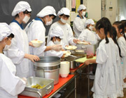 小学校に入学してから1年生は色々なことができるようになっています。会食の場面では、この日から会食当番が始まり、4人のお当番が配膳に入りました。6年生や先生に見守られるなか、集中して仕事にあたりました。盛り付けたお皿をトレーに置くとクラスメイトから「ありがとう」とお礼が伝えられ、励みになったようでした。