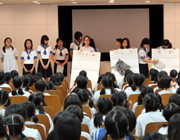 大講堂が工事中のため今年の児童総会は、4年〜6年生までの3学年が参加し小講堂で行われました。5・6年生全員が9つの部会に分かれ、奉仕活動を行っている部の報告がありました。各部からクイズ形式で解り易く活動内容や決まりごとを紹介し、より良い学校生活を送るための「お願い」が発表されました。4年生は来年の部会選びの参考になったようです。 |