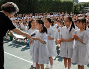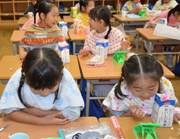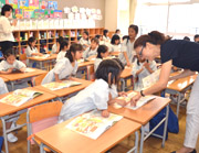 1年生から取り組む週2回の英語の授業では、将来、英語でコミュニケーションをはかるための基礎を培っています。外国人教師と日本人教師によるティームティーチング形式をとり、ネイティブの発音に触れ、より多くの英語を耳にしていきます。この日は先生の英語を聞き取り、あてはまるページを探したり、該当するイラストを英語で答えました。英語で進んでいく授業にも慣れ、楽しそうに取り組む姿がみられます。 |