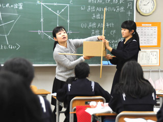 実際に立体と棒(直線)を用い、空間図形のイメージを頭に焼き付けることができました。 |
