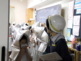地震発生時に、地下会食室より火災が発生した想定で、避難訓練が実施されました。 |