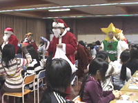 | 食堂の照明が暗くなると、クリスマスの衣装を身にまとった先生が登場。一人ひとりにプレゼントが配られました。 |