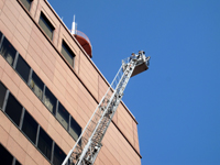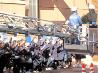 消防署の御好意により、先生が特別にバケットに乗り、あっという間に、バケット部分が地上30メートルの位置まで伸びました。