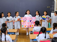 1年生の教室に行って、お店の紹介と遊び方の説明をしました。