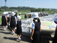 | 荒川の中流に位置する川の博物館。展示物のほか、ペットボトルを使って、川の流れの速さを調べました。 |
